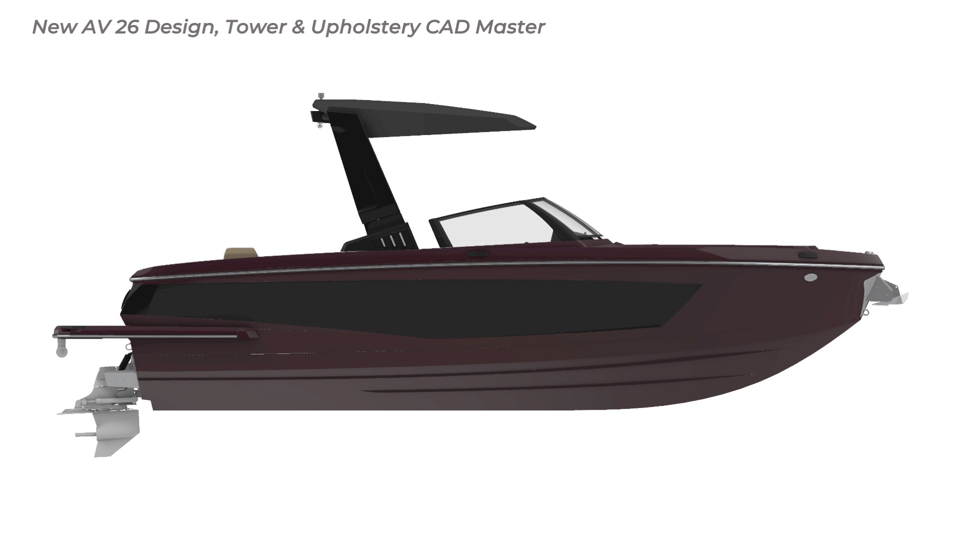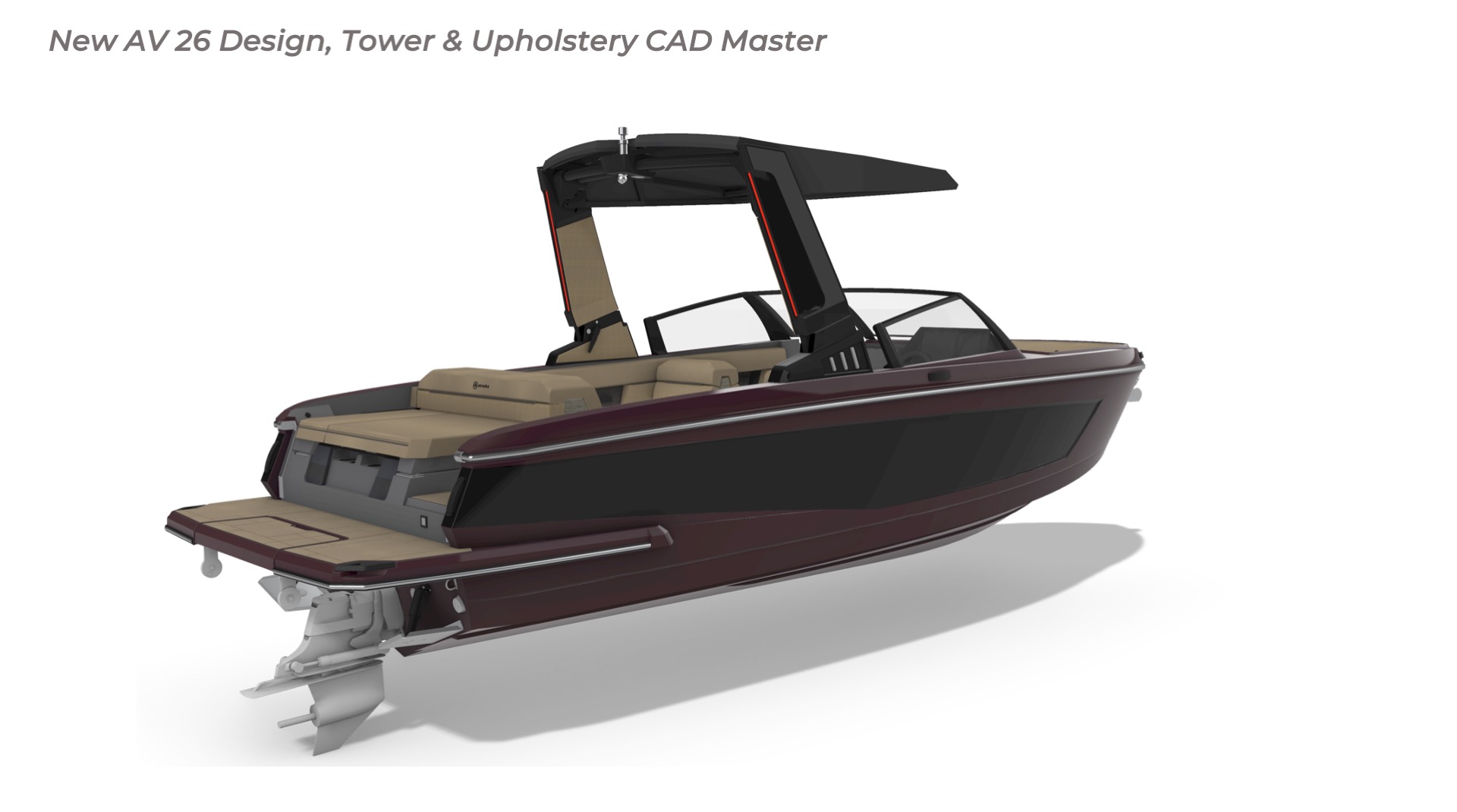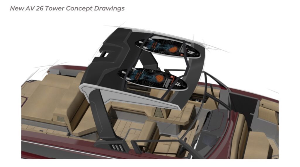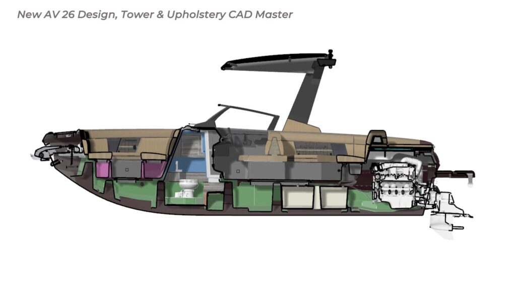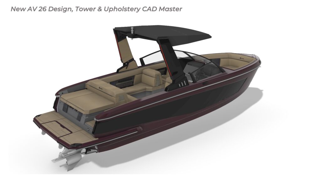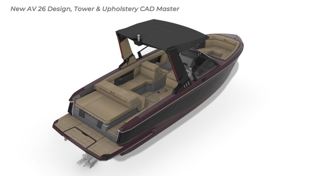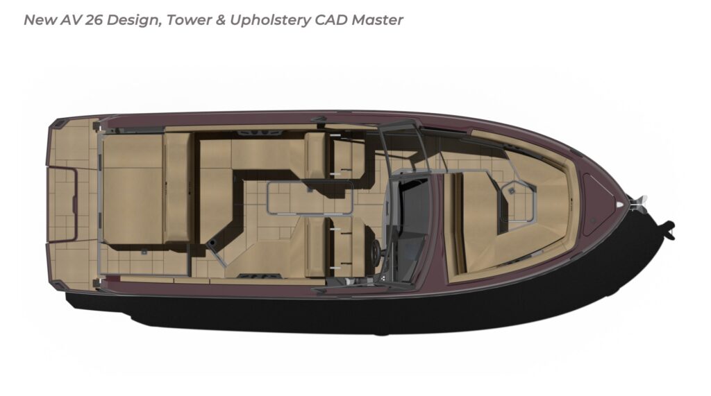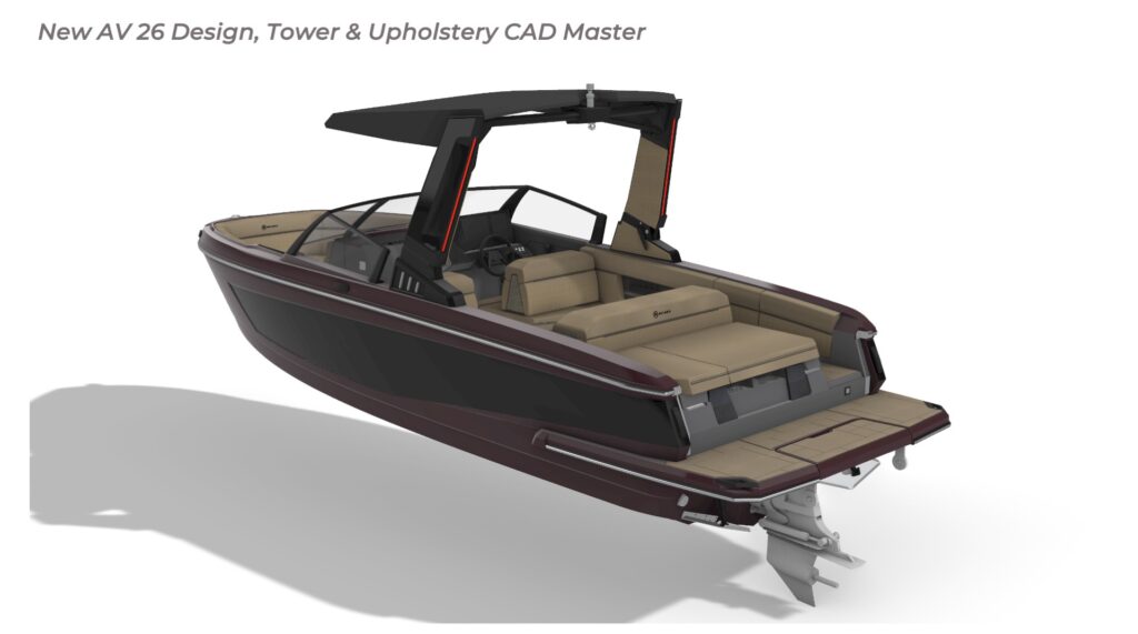 Contribution I played a key role in the conceptual design and development of the Aviara 26 as a scaled-down luxury sibling to the AV28. This included conducting market and reference research on the AV28 to identify scalable premium elements, followed by creating detailed CAD master to visualize the progressive European styling, steep bow angles, open layout, bow and cockpit arrangements, and integration of high-end features in the compact 26-foot format—capturing the AV28’s bold aesthetic and luxurious proportions while adapting them for a more maneuverable size. I also authored the functional requirements and criteria control document, outlining key performance targets, standards, and design constraints to guide the tower project team. I also developed new tower design concept drawings—exploring integrated hard-top, folding tower, or arch options with clean, modern lines, structural integrity, and aesthetic harmony—to enhance watersports capability and provide shade and elevate the boat’s sporty yet refined profile while maintaining seamless integration with the AV28-inspired styling. Collaborating with naval architects and engineering teams, I contributed to refinements through initial CAD dimensional studies to achieve superior performance. I led material selection for upholstery, finishes, hardware, composites, and interior accents, choosing premium marine-grade fabrics, durable yet soft-touch vinyl’s, UV-resistant foams, high-end stainless accents, and gelcoat/color options to elevate tactility, longevity, visual cohesion, and overall luxury feel consistent with Aviara’s positioning. Finally, I developed the CAD master model—including all fiberglass, seating components, and hardware—ensuring precise geometry, structural integrity, seamless fit between parts, ergonomic flow, manufacturability, and production readiness. My work emphasized balanced integration of aesthetics, function, premium detailing, and engineering precision to support Aviara’s high standards for quality and innovation in this lineup-expansion project.
