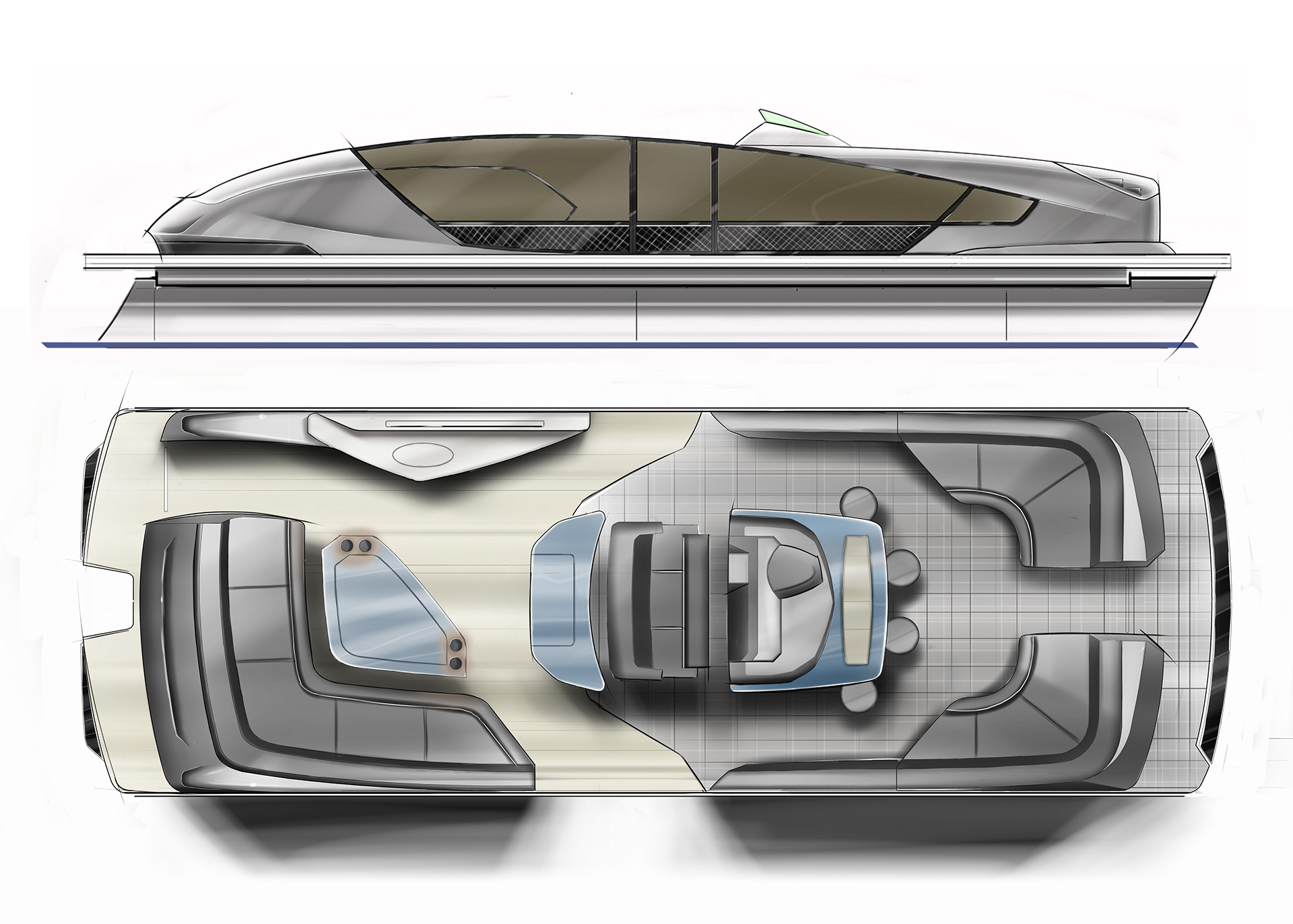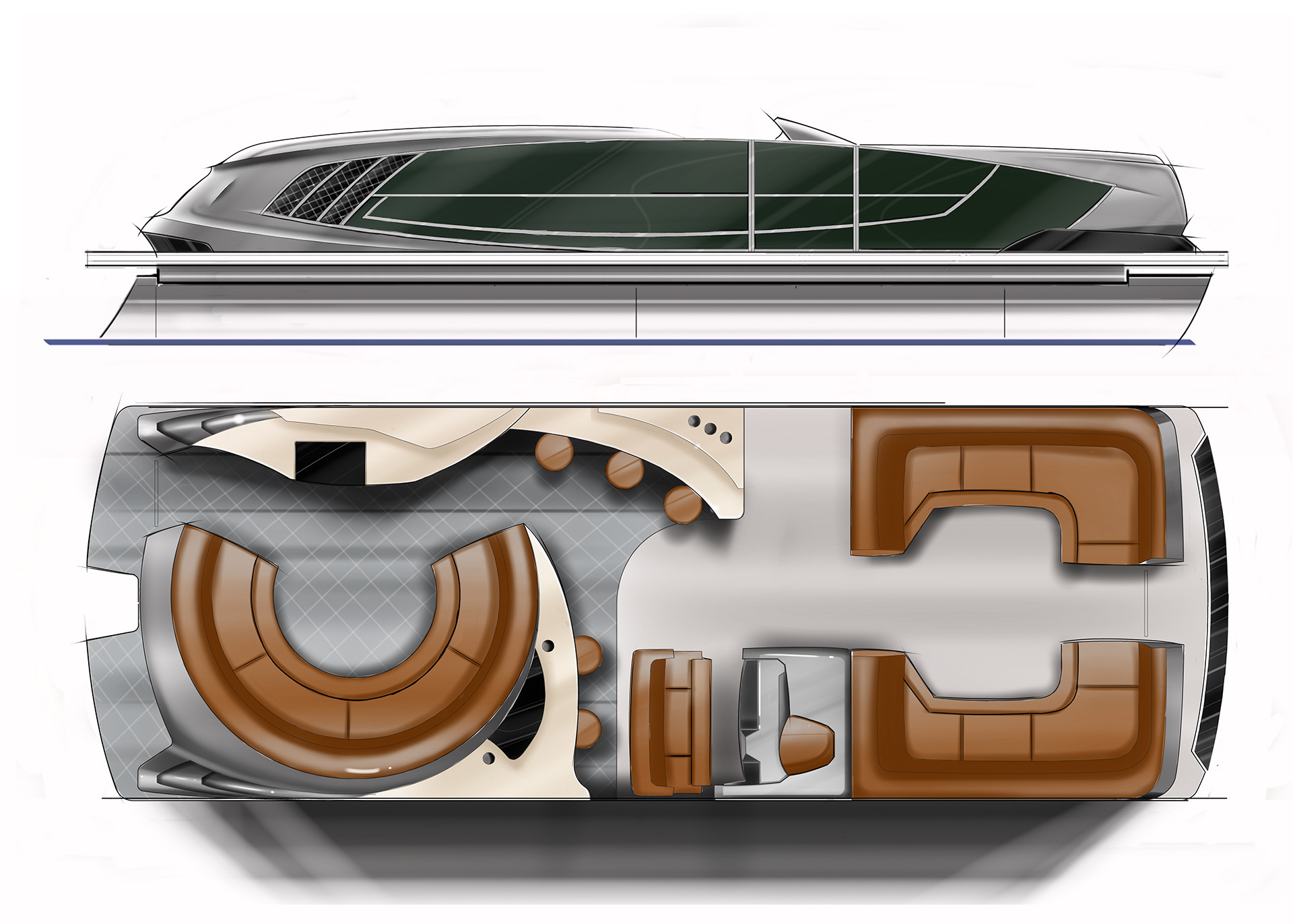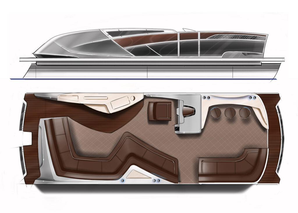 As a design engineer, I developed a series of Classic Concepts—early exploratory design studies focused on reimagining classic, timeless aesthetics for future pontoon and marine products. These were pure conceptual explorations rather than production-intended models, aimed at investigating elegant proportions, ornate detailing, retro-inspired elements blended with modern functionality, and potential directions for brand evolution in the pontoon category. The concepts emphasized rich, sophisticated styling cues (such as refined rail designs, classic graphics, and luxurious interior themes) to evoke heritage while pushing toward innovative future possibilities, serving as creative ideation for long-term product strategy.