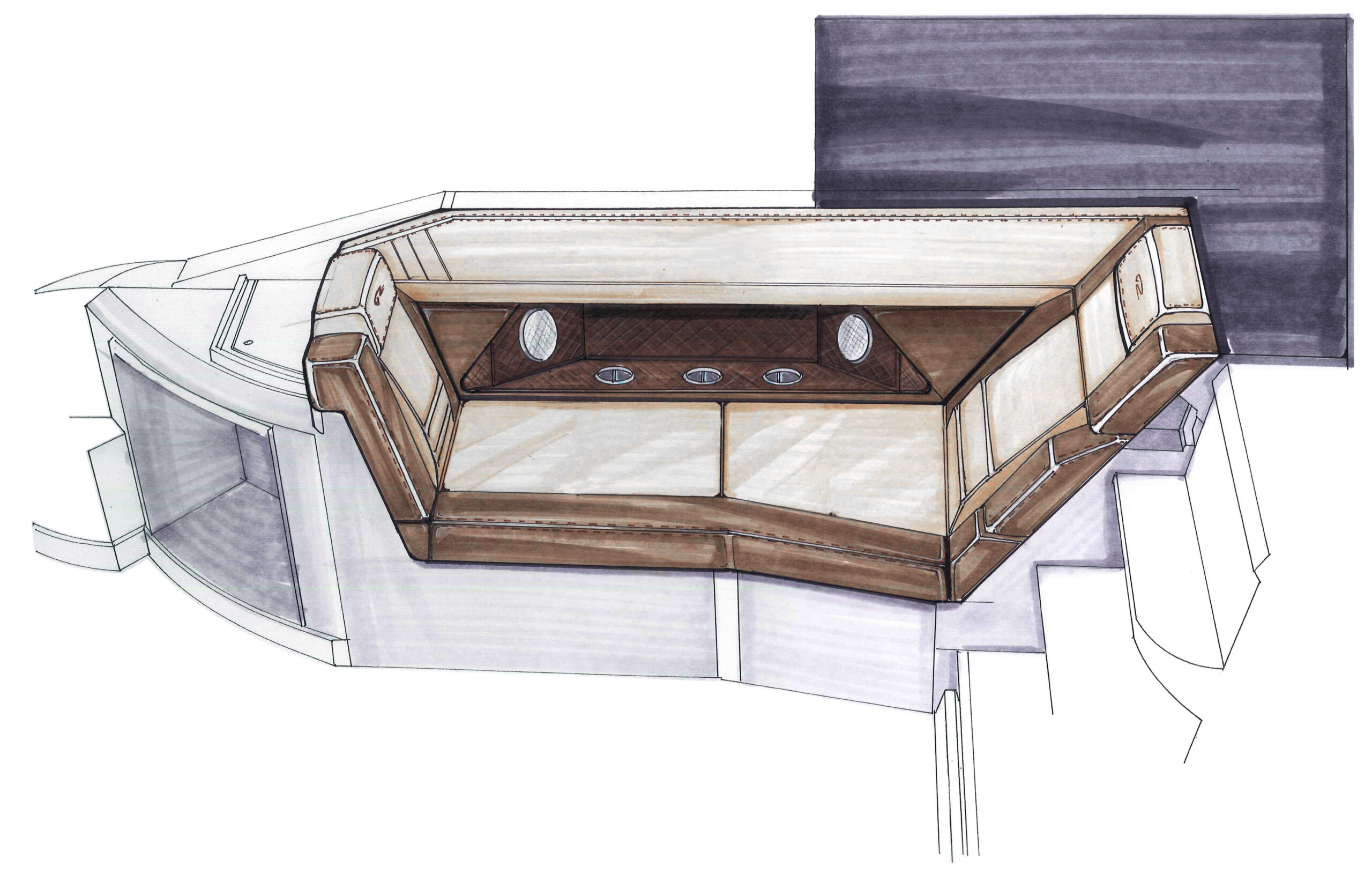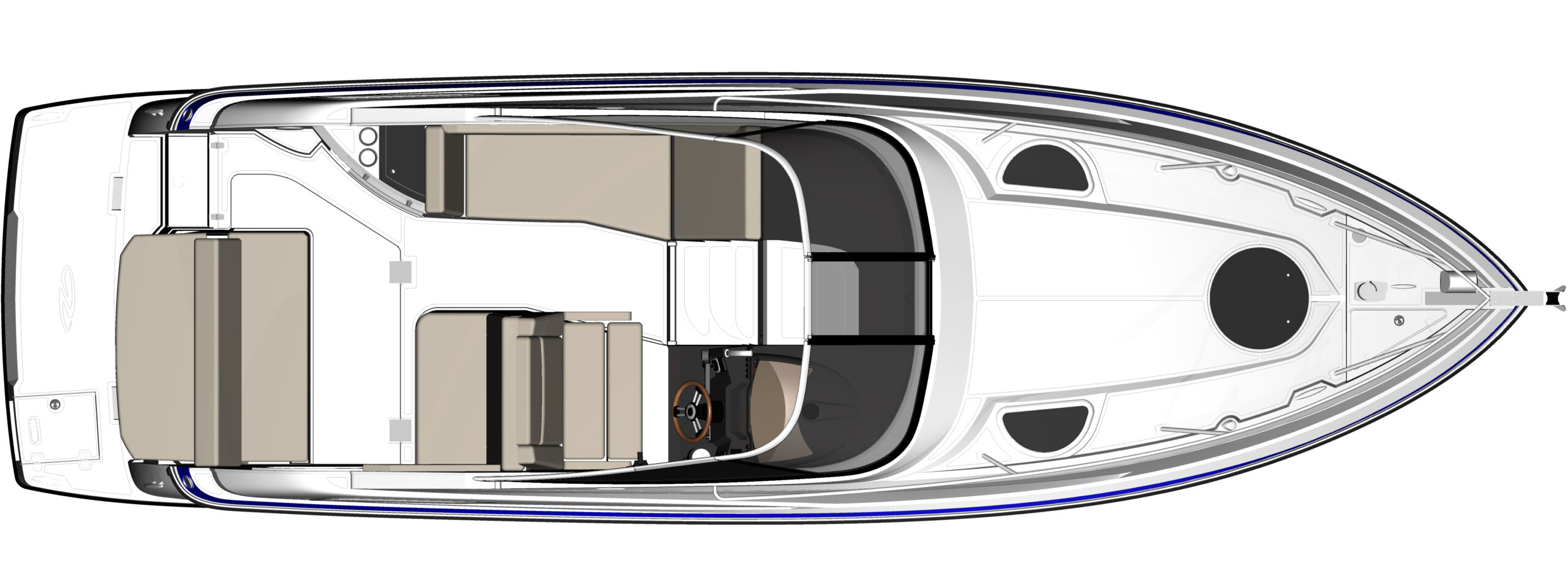 I was responsible for creating detailed profile and plan renderings, upholstery drawings, and the final 3D tooling model for all fiberglass components. This included modeling the deck, hull, cabin top, and smaller parts like hatches and consoles. the deck and select small parts were machined as plugs using a 6-axis CNC router, which were then used to create production molds. This method guaranteed consistent quality and fit for fiberglass parts, reducing assembly time and enhancing structural integrity.